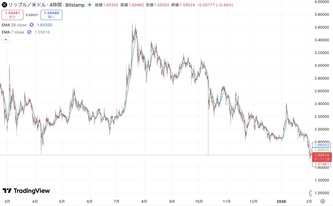 1.80ドルの防衛ラインも虚しく突破されリップル(XRP)は1.60ドル付近まで値を切り下げています。昨年後半からの下落トレンドが継続しており、移動平均線が幾重もの抵抗帯となって上値を抑えつける極めて厳しい「冬の時代」が続いています。