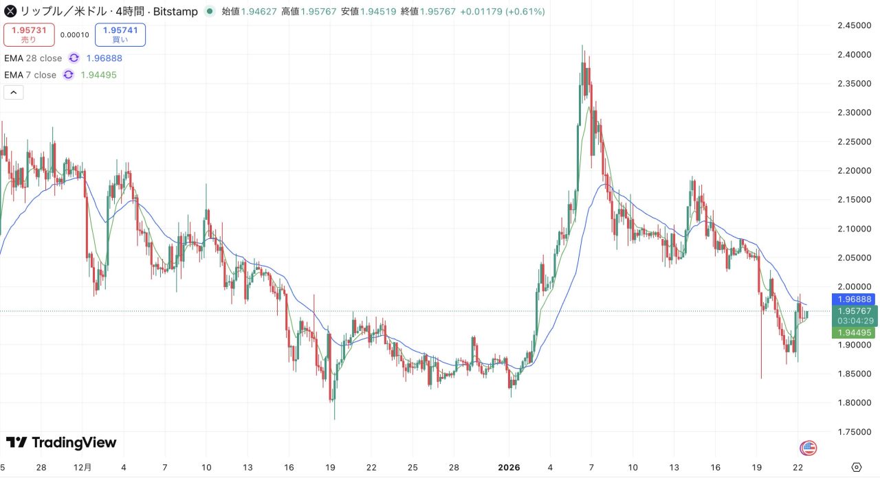 1.90ドル付近での激しい攻防を凌いだリップル(XRP)は売り一巡感から買い戻しが優勢となり、1.95ドル台後半まで値を戻しています。4時間足チャートでは価格が短期移動平均線を上抜けており、下落トレンドからの転換を模索する重要な局面に差し掛かっています。