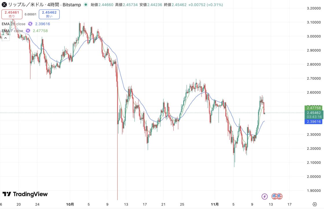 XRP/USDの4時間足チャートを見ると、11月7日頃の安値からV字に近い形で急反発し短期的な上昇トレンドを形成していることがわかります。