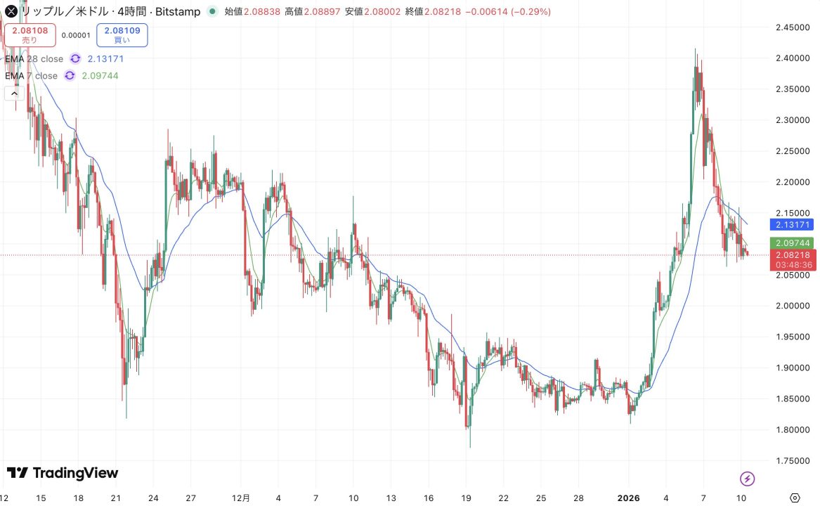 リップル(XRP)、需給悪化で「戻り売り」ー2.00ドル崩壊でパニック売りか【仮想通貨チャート分析】