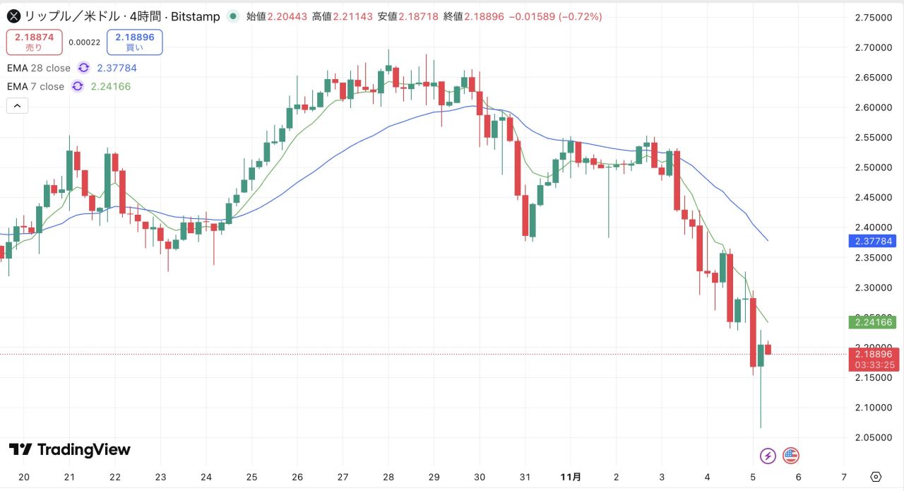 XRP/USDの4時間足チャートを見ると、10月末に短期の7期間指数平滑移動平均線(EMA)が、中期の28期間EMA(青線)を下抜ける「デスクロス」を形成しました。