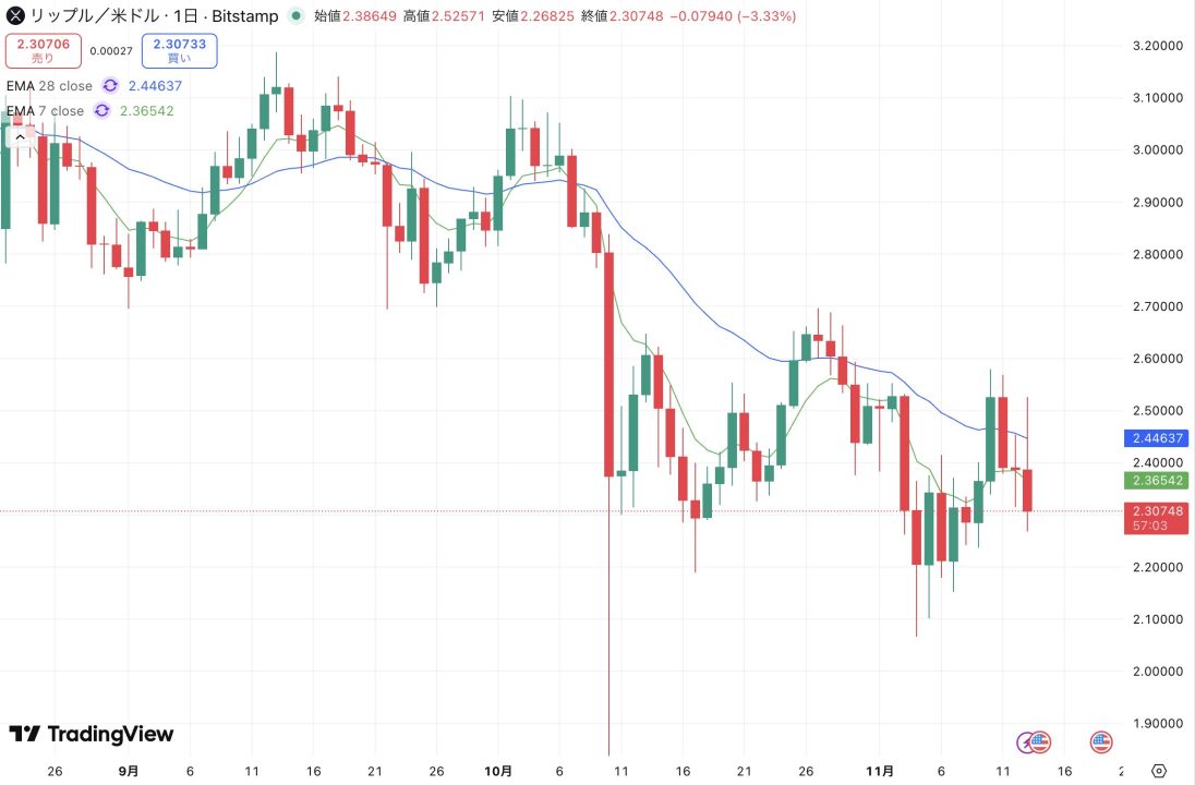 XRPの日足チャートを分析すると、短期の7期間指数平滑移動平均線(EMA)(緑線)が、中期の28期間EMA(青線)を明確に下回る「デスクロス」の状態が継続しています。