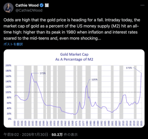 現在の金(ゴールド)高騰そのものに対しても警戒の声が上がり始めています。大手VC「ARK Invest」のキャシー・ウッド氏は米国のマネーサプライ(M2)に対する金の時価総額比率がインフレが深刻だった1980年のピーク時を突破し、さらに世界恐慌下の1934年に記録した史上最高水準にまで到達したと指摘。