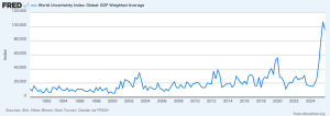 世界経済の先行きに対する不透明感を示す「世界不確実性指数(WUI)」が、歴史的な高水準に達していることが明らかになりました。最新のデータによると同指数は2020年のパンデミック時のピークを塗り替え、さらには2008年の世界金融危機(リーマン・ショック)や2001年の不況時の水準をも上回っています。