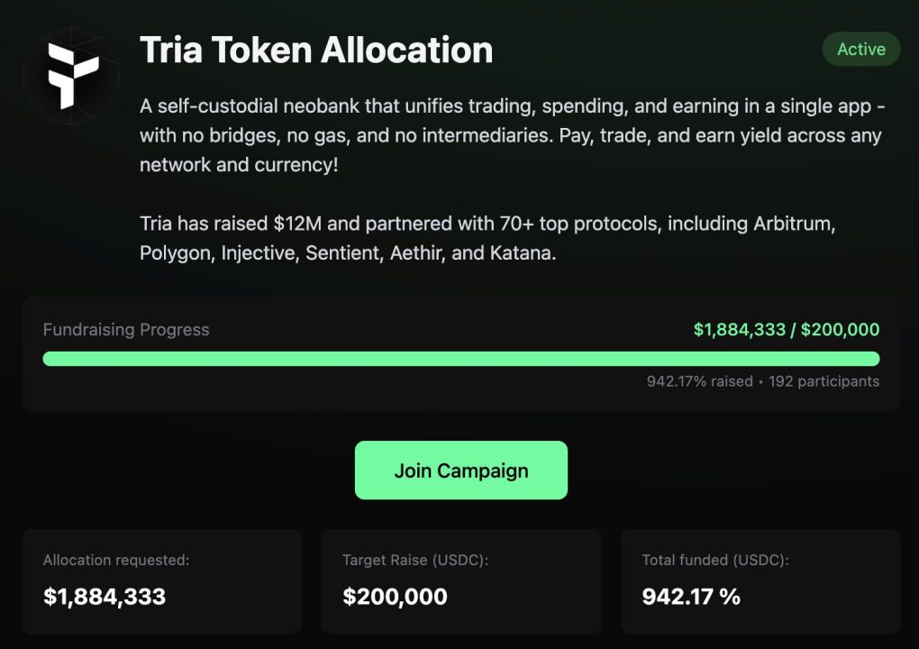セルフカストディ型のネオバンク「Tria」がインフルエンサーマーケティングプラットフォーム「KOLpad」を通じてトークンセールを実施。目標金額20万ドルに対し、既に192人の参加者から約188万ドルを集め成功を収めています。