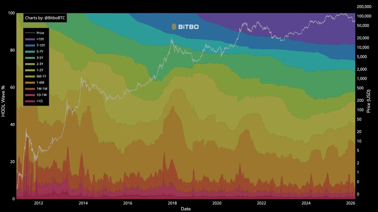 ビットコイン(BTC)の市場サイクルを正確に把握するため、投資家の保有行動を可視化する複数のオンチェーン指標が注目されています。ビットコインのHODLウェーブは、総供給量におけるコインの年齢(最後に移動してからの期間)をマクロな視点で可視化した指標です。
