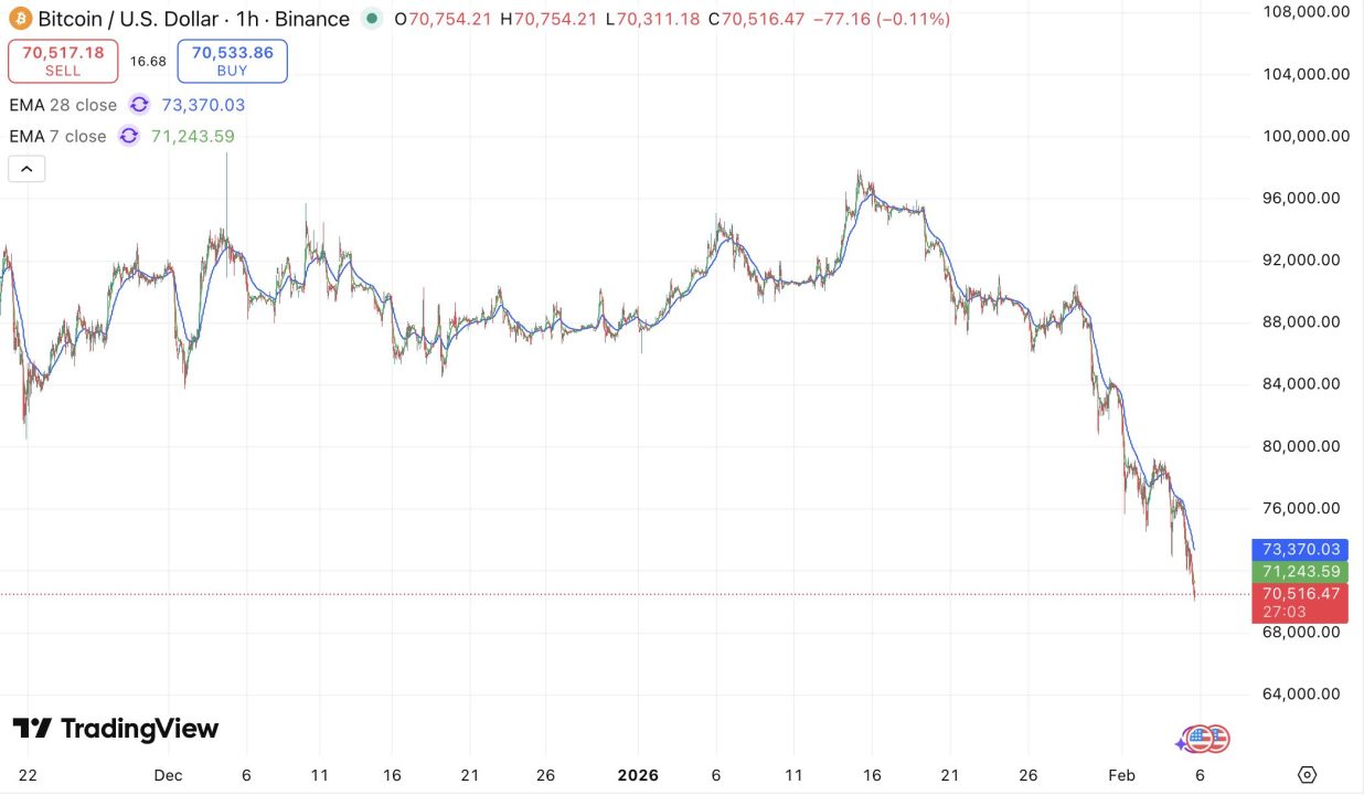 ビットコイン(BTC)は心理的・テクニカル的な最重要ラインである70,000ドルの節目を目前に、踏みとどまれるかどうかの瀬戸際に立たされています。