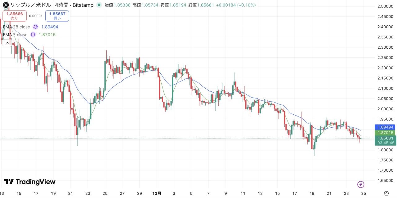 リップル(XRP)は4時間足レベルで「戻り売り」の圧力が勝っている状況です。移動平均線が下向きで価格を押さえつけている限り、本格的な上昇は期待しづらく目の前のサポートである1.85ドルを死守できるかが直近数時間の焦点となります。