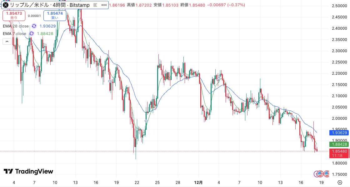 XRPの4時間足チャートを分析すると、価格は右肩下がりの移動平均線に沿ってズルズルと値を下げています。